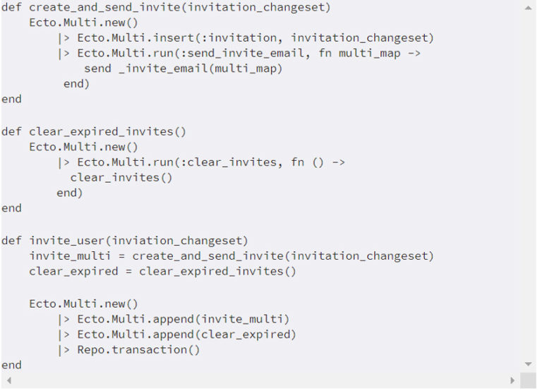 The most straightforward way to use Ecto.Multi is to chain individual changesets together. insert, update, and delete functions are available and all behave as you might expect them to, with all operations are executed in the order in which they are added. You can imagine a transaction dealing with a user signing up via an invitation email might look something like this: