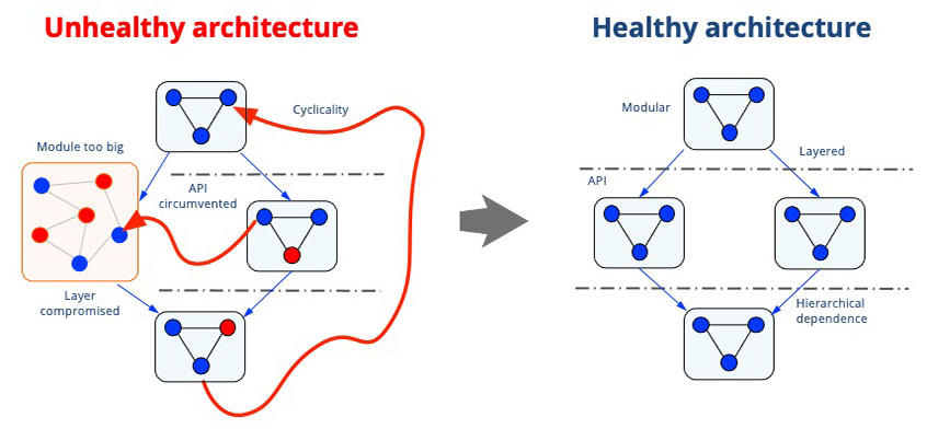 By using sophisticated tooling to analyze the actual code, we can discover areas where modularity in a codebase has broken down in ways the developers often don’t understand. For example, we identify highly interdependent pieces of code that can be difficult to maintain and enhance. The more direct or indirect cyclical dependencies a codebase contains, the higher the chances of defects being introduced as developers work on it. This is important because studies have shown that these architectural “hotspots” (known as cores in academic literature) are also places with significant defects and where developer productivity grinds to a halt. Rapid and automated design quality analysis can identify these risky hotspots, like the ones called out in the unhealthy architecture in Figure 3, so a plan can be put in place to fix them and move toward a healthier, modular, layered, and hierarchical architecture like the healthy architecture in Figure 3.