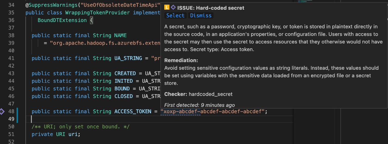 Figure 3: Code Sight in VS Code detecting a leaked access token in a Java source file