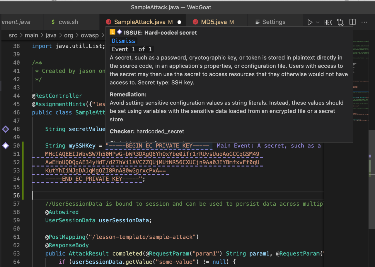 Figure 2: Code Sight in VS Code detecting a leaked SSH key in a Java source file